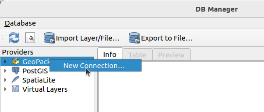 Z menu po lewej stronie (Providers), kliknąć prawym klawiszem myszy na Geopackage i wybrać New Connection. Ustaw połączenie do pliku world_countries_attr.gpkg