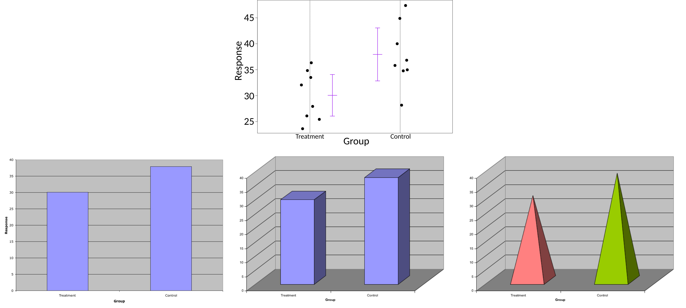 - Wykres c: każdy słupek przedstawiony za pomocą własnej skali dla osi y. Nieporównywalne wartości na osi y wprowadzają w błąd - sprawiają wrażenie, że obiekty A, B, C są mają bardziej zbliżone wartości niż jest w rzeczywistości (A = 3, B = 5, C = 4)