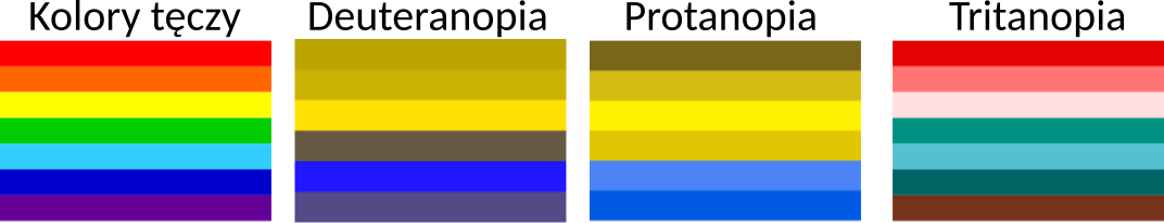 - Protanopia - nierozpoznawanie barwy czerwonej (lub mylenie jej z zieloną)